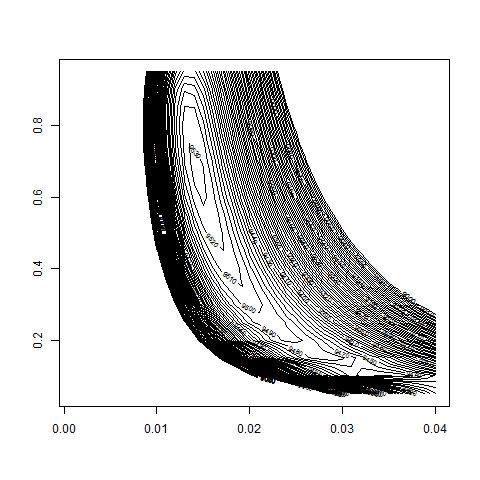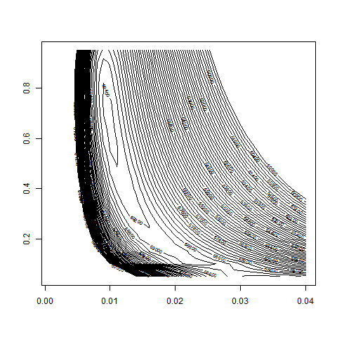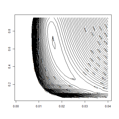 Contour plot of the log-likelihood function logL(bsvol,w0) for DAX-Data,